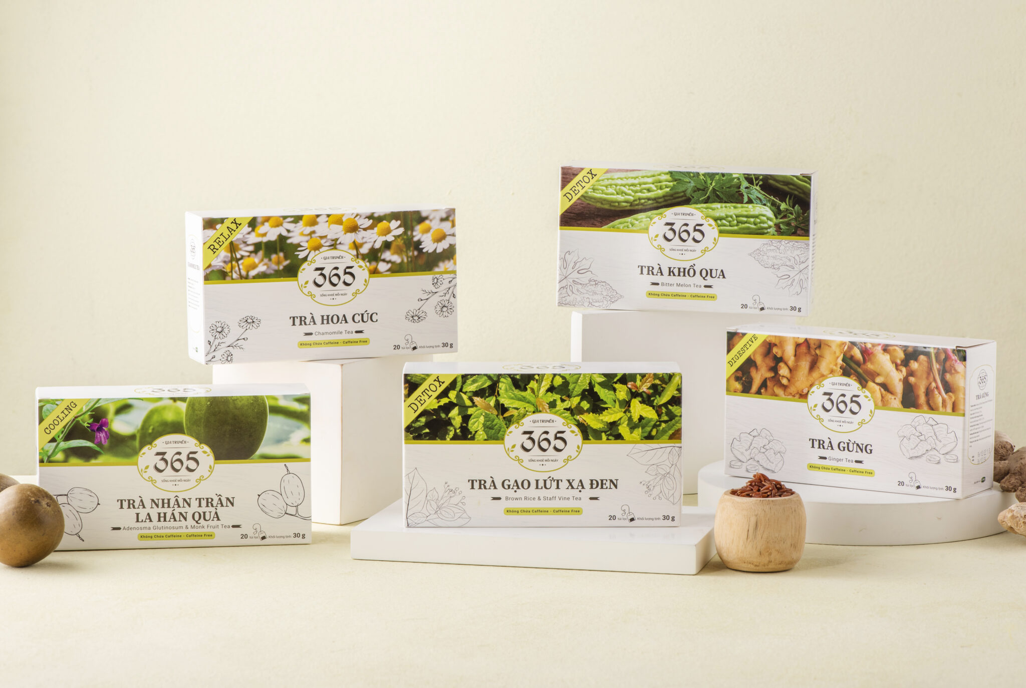 Sau nhiều năm không ngừng nghiên cứu và phát triển về trà, Công ty đã thành công ra mắt Trà thảo mộc nhãn hiệu 365 với các dòng sản phẩm: Trà gạo lứt xạ đen, trà hoa cúc, trà nhân trần la hán quả, trà gừng, trà khổ qua và trà atiso.